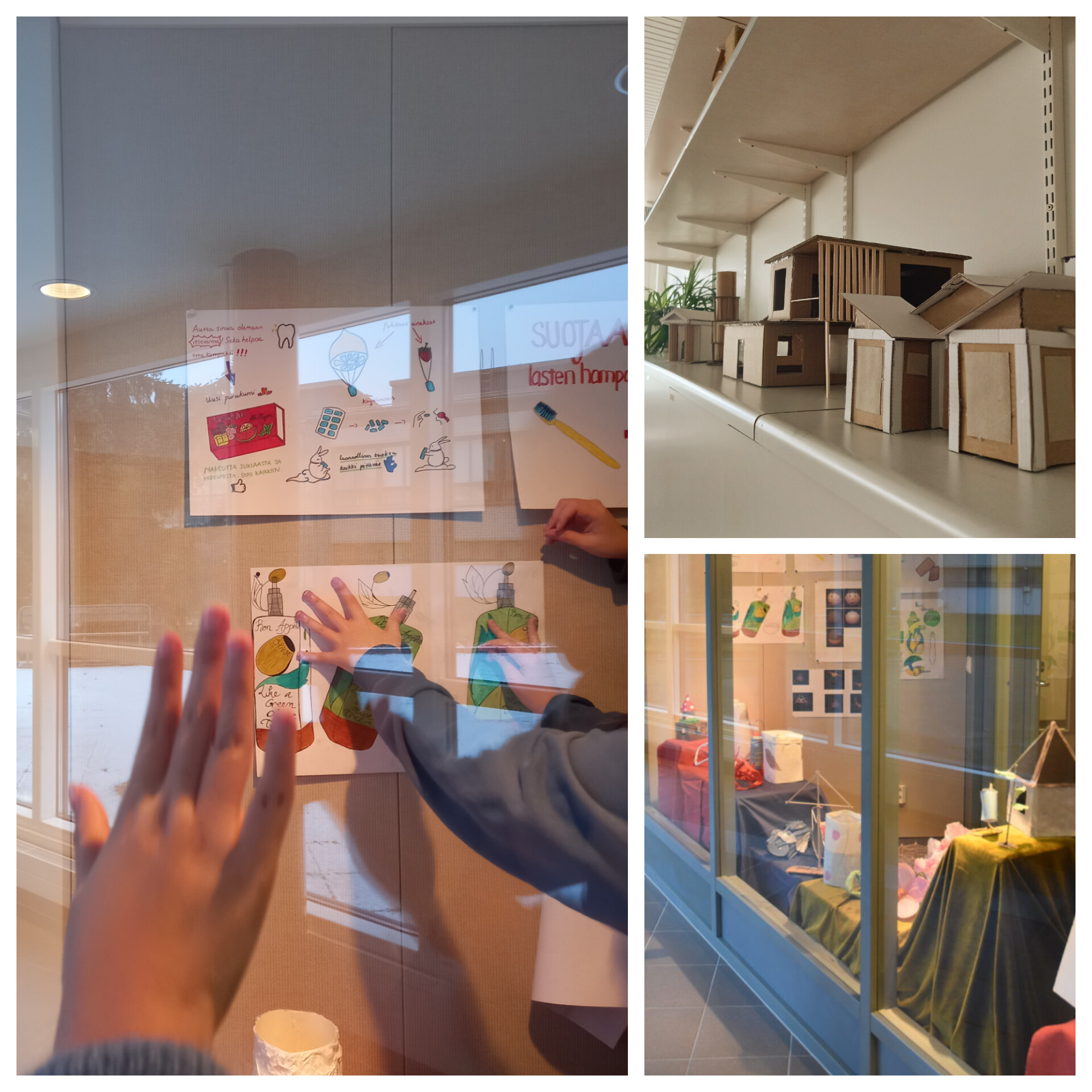 Myös muiden kuviksen opintojaksojen tuotoksia päästiin ihailemaan koulun tiloissa: KU01 opintojakson haitaritehtävät toivat väriä älyeteisen näyttelyseinälle. Loppukeväästä KU02: Ympäristön tilat, paikat ja ilmiöt -ryhmien teoksia asetettiin esille kirjastokäytävälle ja projektiviikon päätteeksi ovensa avanneen uuden opiskelu- ja oleskelutilan seinille ja hyllyille. Esille pääsi upeita pienoismalleja, kollaaseja sekä opiskelijoiden omaa ympäristöstä kertovia piirroksia.