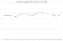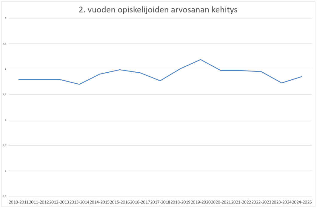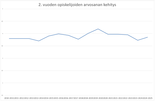 Toisen vuoden opiskelijoiden antaman arvosanan kehitys 2010-2025savonlinnan lyseon lukioToisen vuosikurssin olokysely 2024-202525.3.2025