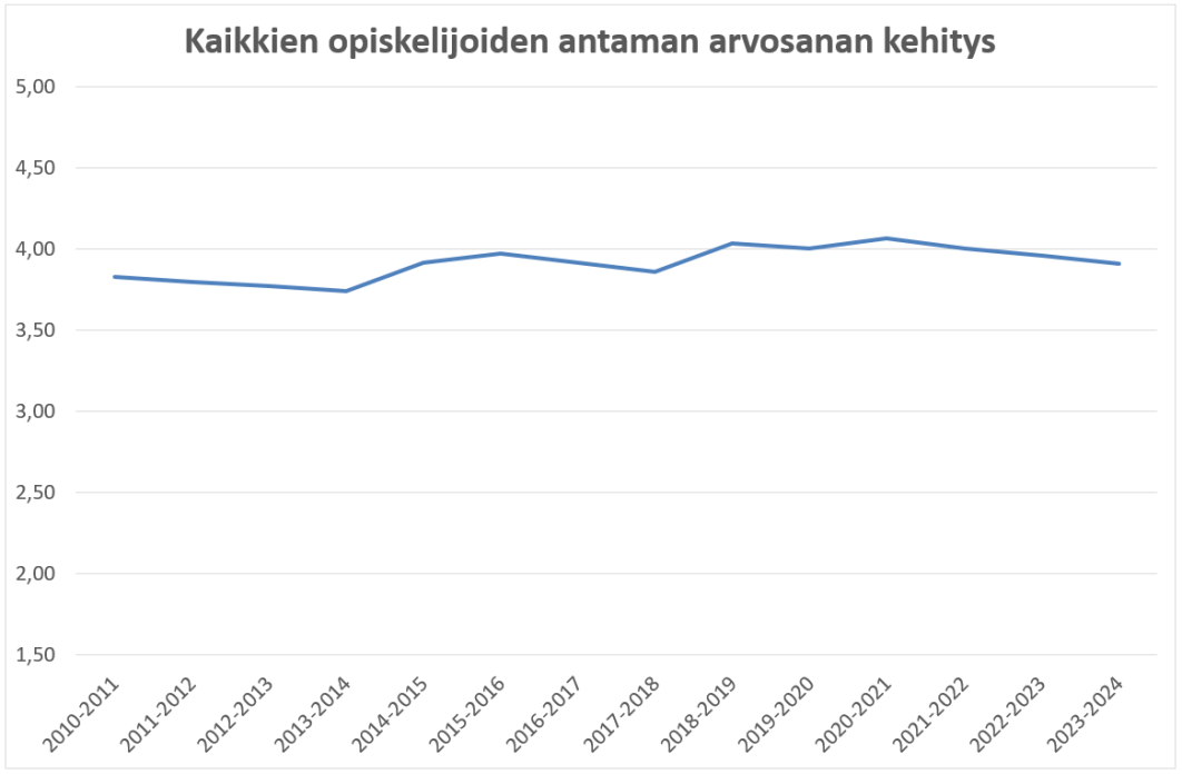Kaikkien opiskelijoiden antaman arvosanan kehitys 2010-2025Savonlinnan lyseon lukioKolmannen vuosikurssin päättökysely 2024-202526.3.2025