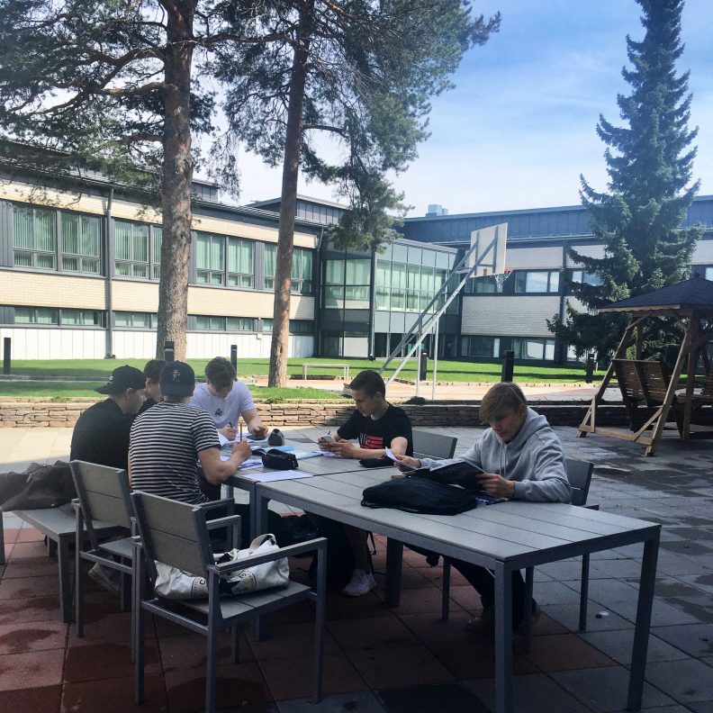 Opiskelijat opiskelemassa Lyseon sisäpihalla toukokuussa.