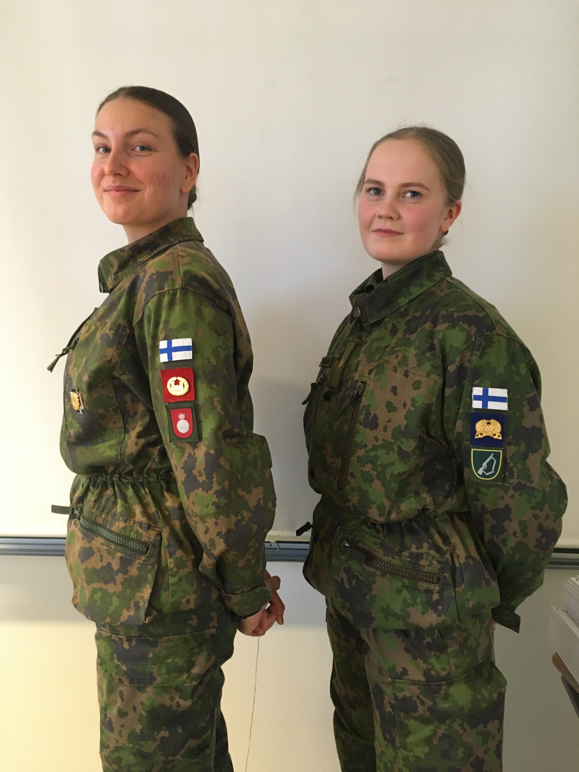 Miia Kinnunen ja Mirja Tolvanen kävivät koululla kertomassa naisten vapaaehtoisesta asepalveluksesta.
