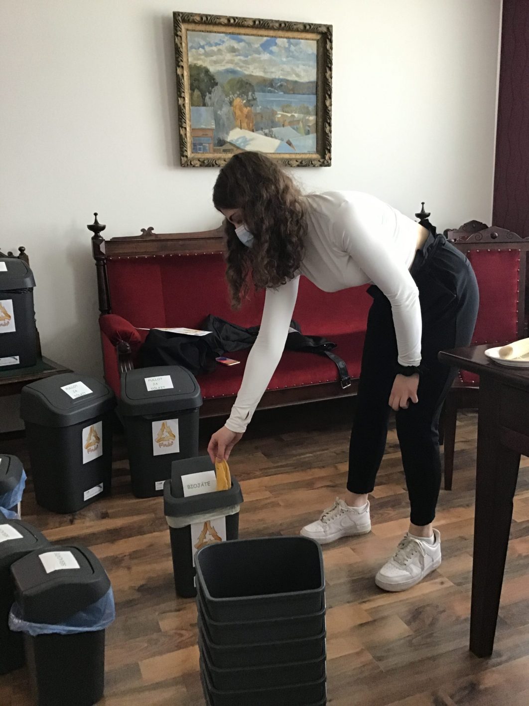 Opiskelijakunnan hallituksen jäsenet tarroittivat uudet kierrätysroskikset ja ne otettiin heti käyttön.