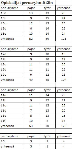 Jokainen opiskelija kuuluu johonkin perusryhmään. Ryhmä määräytyy sen mukaan, minkä vuosikurssin opintoja hänellä on eniten ohjelmassaan. Kevätlukukauden loppuessa koulussamme on 352 opiskelijaa, joista poikia on 157 (45%) ja tyttöjä 195 (55%).