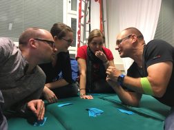 Opettajat ja rehtori pelaamassa aliasta lukiosanoilla.