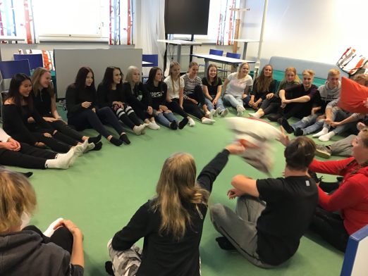 Uudet lukiolaiset pelaamassa tyynyformulaa ensimmäisenä koulupäivänä.