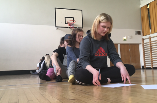 Uusien tutorien koulutuksessa leikittiin rikkinäistä puhelinta piirtämällä kuvia selkään.