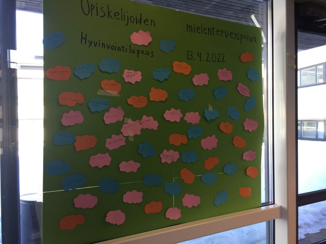 Valtakunnallinen opiskelijoiden mielenterveyspäivä osui projektiviikolle ja sitä vietettiin keskiviikkona 13.4. Tämän vuoden teemana oli myötätunto. Päivän tarkoituksena oli herättää keskustelua opiskelijoiden mielenterveydestä sekä kutsua kaikki mukaan toimimaan mielen hyvinvoinnin puolesta. Lyseon aulassa oli kuraattorien ja Yhessä eteenpäin -hankkeen pitämä piste, jossa opiskelijat saivat tehdä itselleen hyvinvointilupauksen. Aulaan koottiin teos pilvistä, joihin opiskelijat kirjoittivat itselleen hyvinvointilupauksen: